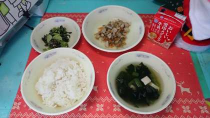 「とりめしの具」は、鶏肉のほか、にんじん、ごぼう、干しいたけなどたくさん具が入った食べ応えたっぷりの献立です。ごはんに混ぜて、おいしくいただきました。具材が細かく刻んであるので、ごはんに混ぜて食べやすかったです。「とうふの吉野汁」は、しょうがの風味がよく効いていて、今日のように寒い日には体が温まる献立でした。