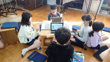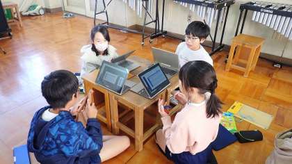 グループで、打楽器の音楽づくりに取り組んでいます。強弱や音色の特徴、音の重なり方を意識して、いろいろなパターンを試しています。おもしろいと思う組み合わせたかができたら、ロイロノートのシートに記録していきます。