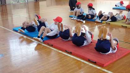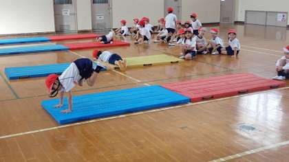 「丸太転がり」や「ゆりかご」、「川跳び」などの技に挑戦して楽しんでいます。自分が終わった後は、次の順番の友達のために、しっかり安全確認をすることもできていました。