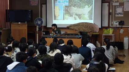 人間の生活が、オオサンショウウオだけでなく多くの生き物に影響を与えていることや、その解決のために自分たちに何ができるかについて考えることができました。最後には、京都水族館と学校をオンラインでつないで、今のオオサンショウウオの様子を見せていただきました。