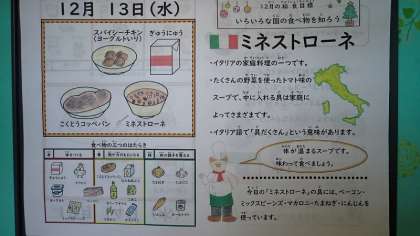 「ミネストローネ」は、イタリアの家庭料理です。ベーコンや野菜、マカロニなどを使ったトマト味の具だくさんスープです。給食では、ベーコン、ミックスビーンズ、マカロニと、たまねぎやにんじんなどの野菜を使って作りました。