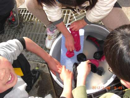 昔体験の最後に洗濯板を使って,靴下を洗いました。