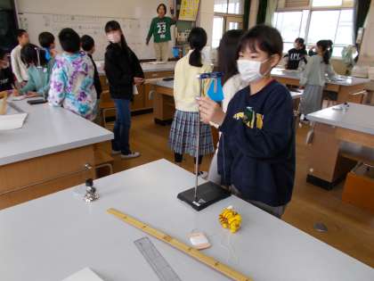 ふりこの一往復する時間が変わることが分かってきた子どもたちは、ひもの長さやおもりの重さに気を付けて、班で話し合いながら活動を進めていました。子どもたちの「なぜ?」を大切に進めていきたいと思います。