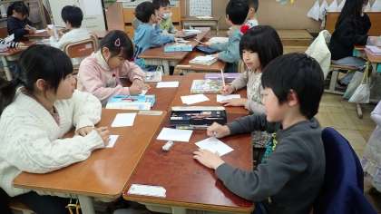 ものには、「りんご」や「みかん」のように「一つ一つにつけた名前」と、「くだもの」のように「まとめてつけた名前」があります。これらについて学習したあと、「お店屋さんごっこ」をするための準備をしています。