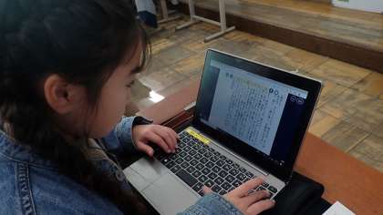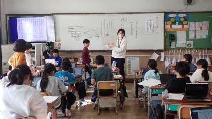 自分で考えた物語の下書きをしています。下書きではタブレット端末を使っているので、あとからでも文の順番を入れ替えることも簡単です。清書は、原稿用紙にていねいに書いていきます。どんな物語ができあがるか楽しみです。