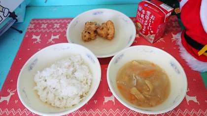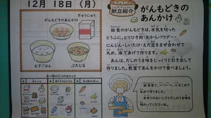 「がんもどきのあんかけ」は、給食室で一つ一つ手作りした「がんもどき」に、とろとろの「あん」をかけて食べます。「がんもどき」は、水気を切ったとうふに、鶏ひき肉、おからパウダー、にんじん、しいたけ、枝豆を混ぜ合わせて丸め、油で揚げて作りました。だしの効いた「あん」との相性がぴったりで、とてもおいしくいただきました。