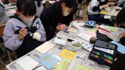 作品は、いろいろな色のはがきに摺りました。できあがった金色の「鱗文」と紙の色との組み合わせで、とてもカラフルなはがきができました。はがきと版木を持ち帰っていますので、ぜひ、ご家庭で見ていただければと思います。
