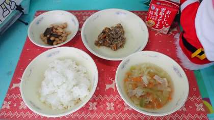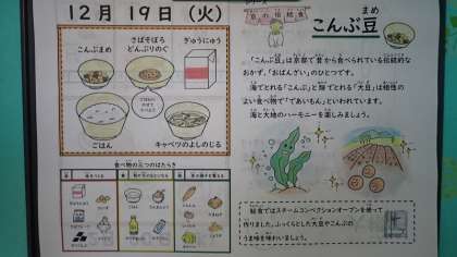 今日は、子どもたちの大好きな「さばそぼろ丼」です。さばの水煮と細かく刻んだたまねぎ、にんじん、干しいたけが甘辛く味付けされており、ごはんに混ぜるとちょうどよい味になります。とてもおいしい「さばそぼろ丼」で、いつも以上にごはんを食べられる子がたくさんいました。「こんぶ豆」は、スチームコンベクションオーブンで調理しています。昆布も豆もふっくらとやわらかく、おいしくいただくことができました。