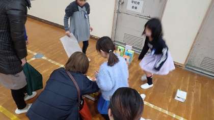 はじめのあいさつのあと、2年生の遊びのお店がスタートしました。3クラス合わせて、15以上のお店が体育館に並んでいます。1年生の子どもたちがお客さんになって、いろいろなお店から楽しそうな声が聞こえてきました。