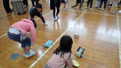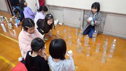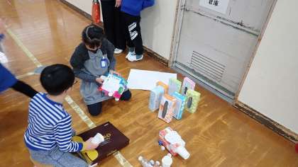 2年生の子どもたちは、たくさんの身辺材料を使って「積む」「はじく」「飛ばす」「転がす」などの遊びに存分に浸ってきました。その中で、おもしろい遊び方を見つけて今日まで練り上げてきました。