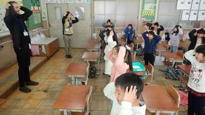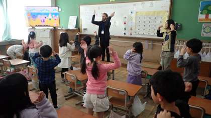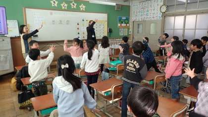 今日は、ALTの先生が教室に来てくださいました。ALTの先生と一緒に、これまでに学習したことを復習しました。「Rock,Scissors,Paper One,Two,Three!」と言いながら英語での「じゃんけん」をしたり、体あそびをしながら「Head,Shoulders,Knees,And,Toes」の歌を歌ったりして楽しみました。