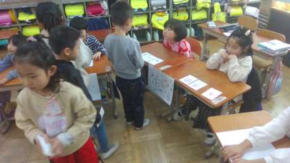 準備の段階では、それぞれのお店に分かれ、そのお店ではどのような物を売ればよいかグループで話し合いました。売るものをカードに書き、看板などもしっかり作って、いざ開店です!