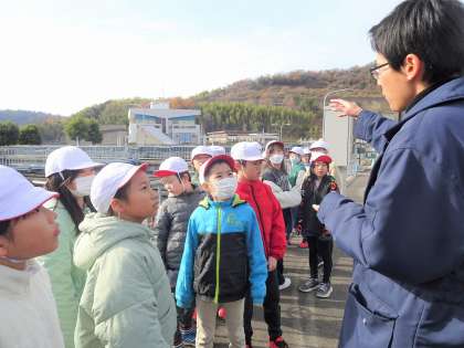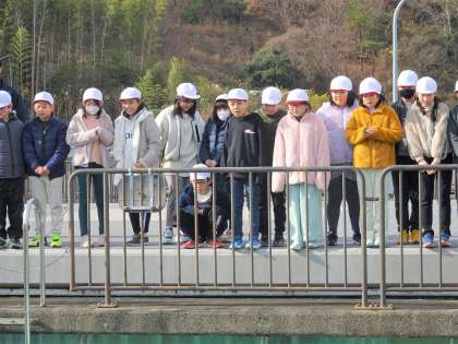 2学期末に行った社会見学の子どもたちの様子です。社会見学では、新山科浄水場と琵琶湖疏水をめぐり、自分たちの使っている水道水のできかたやその歴史をじっくりと学びました。