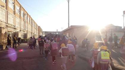 3学期最初の朝はとても寒い朝で、プールサイドの水たまりにもうっすら氷が張っていました。8時になると、ひさしぶりに子どもたちが元気に登校してきました。3学期最初の朝は、PTAのみなさんもあいさつで迎えてくださいました。