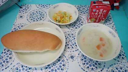 今日のクリームシチューには、脱脂粉乳ではなく豆乳が使われています。豆乳が加わることで、ほんのりとした甘みが感じられます。また、普段のクリームシチューよりさらっとした口当たりのルーになっており、とてもおいしくいただくことができました。「野菜のソテー」は、キャベツやコーンの甘みがよく出ていました。色もとてもあざやかで、見た目にもおいしい野菜のソテーでした。