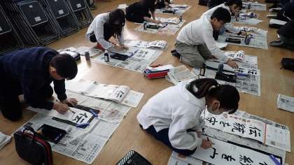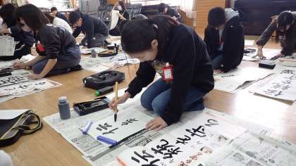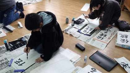 6年生は、書き初めを行いました。普段の半紙ではなく、長い画仙紙に、「伝統を守る」の5文字を書き初めました。みんなお手本を見ながら、真剣な表情で書いていました。
