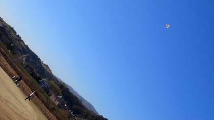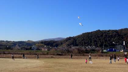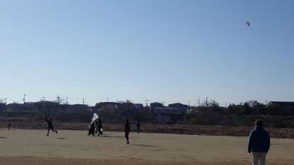 あたたかい陽射しのもと、子どもたちは持ってきた凧を引いて一生懸命走っています。凧が風に乗って高く上がると、歓声が上がっています。