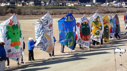たくさんの大凧が一列に並ぶ様子は壮観です。梅津小学校を代表して5年生が作ってくれた大凧も並んでいます。