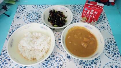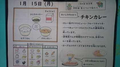 今日は、3学期はじめてのカレーライスでした。休み時間には、給食室からルーのいいにおいが漂ってきて、子どもたちも給食の時間が待ち遠しい思いでいたようです。今日は、チキンカレーだったので、やわらかい鶏肉がたくさん入っています。スパイスのよく効いた手作りのルーのおいしさを味わっていただきました。