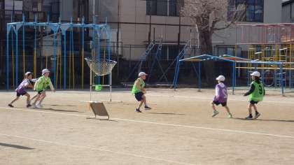 パスゲームでは、ボールをパスしてゴールに向かっていきます。パスを受け取ることができるように、有利な場所に動いて声をかけています。3時間目の学習なので、子どもたちもずいぶんうまく動けるようになってきました。
