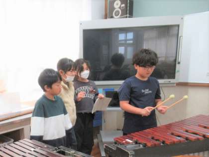 4年生の音楽の学習では合奏の練習を始めました。『茶色の小瓶』を、様々な音色の楽器を使って奏でます。今週は初めての練習で、それぞれのパートに分かれて練習に励みました。