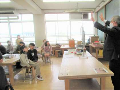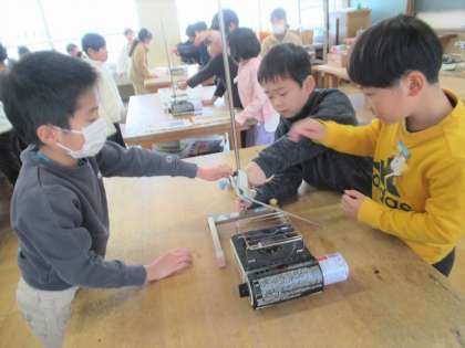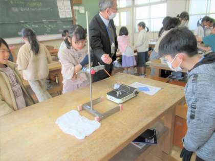 理科の学習で『もののあたたまり方』の実験をしました。今週は金属のあたたまり方についてです。鉄の棒や板をガスであたためてみて、熱の伝わり方を調べました。