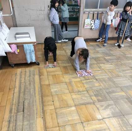 1年生のそうじの様子です。入学してしばらくは6年生に掃除をしてもらっていましたが、今はしっかり自分たちでそうじができるようになりました。