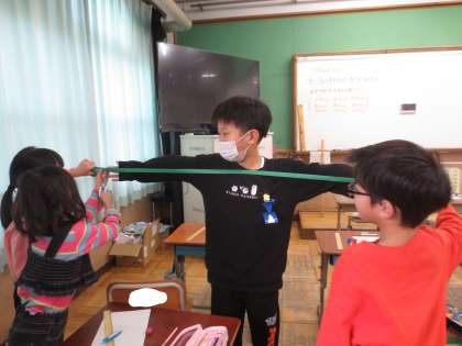 今日は、腕を広げた時の、指先から指先までの長さを測る学習をしました。