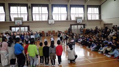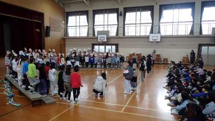 1年生の言葉あそびを、お客さんの2年生も楽しそうに見ていました。そこで、2年生のお兄さんやお姉さんとも一緒になって、言葉あそびをしました。1年生のリズム打ちに合わせて、2年生の代表の子どもたちが、言葉のリレーをしました。