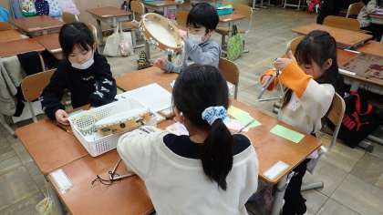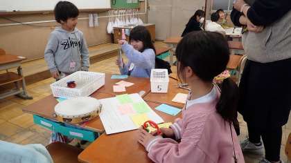 星空のようすを音楽で表現する学習に取り組んでいます。今日は、夕方からすっかり夜になった場面の様子を想像し、グループの友達と協力して音楽づくりをしました。「すず」「トライアングル」「タンブリン」などの楽器を使って、どんな様子を表現できるかを考えました。