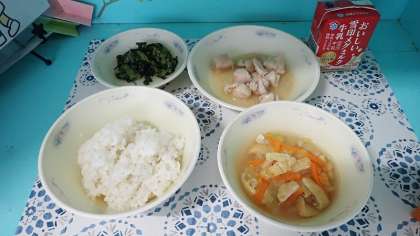 昨日の「タンドリーチキン」はスパイシーな味付けでしたが、今日は、同じ鶏肉でも、あまからい味付けが食欲をそそる「鶏肉のあまから煮」でした。ごはんとの相性もぴったりで、とてもおいしくいただきました。「キャベツのすまし汁」は、だしの風味がよく効いており、たっぷりのキャベツをおいしくいただくことができました。