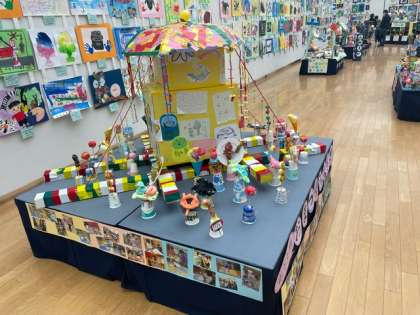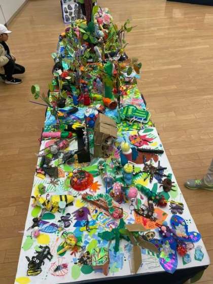 子どもたちは、「小さな巨匠展」を学校から見に行くのが初めてです。岡崎公園で、梅津中学校のお兄さんやお姉さん、放課後等デイサービスなどで知っている子どもたちもいたようで、手を振っていました。