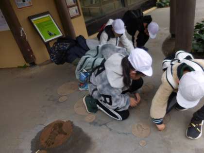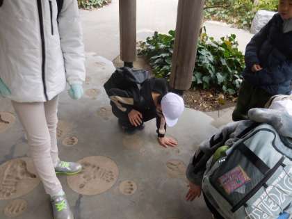 ゴリラの足型や手型と自分の手足を合わせて、大きさを比べていました。