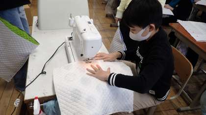 5年生は、家庭科の「ミシンにトライ!手作りで楽しい生活」の学習をしています。