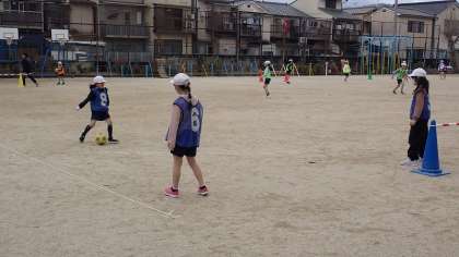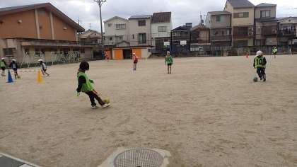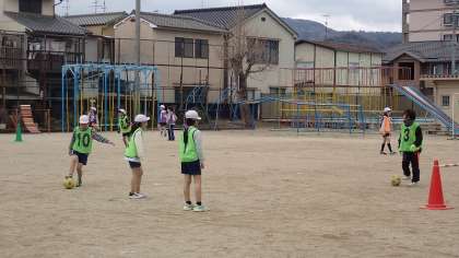 昨日が雨でできなかったので、今日が1回目の学習になりました。チームの友達と一緒に、パスを回す練習をしています。パスは、できるだけ正確に、味方がとりやすいように出すことが大切です。ボールを蹴るときの足さばきに気を付けて練習していました。