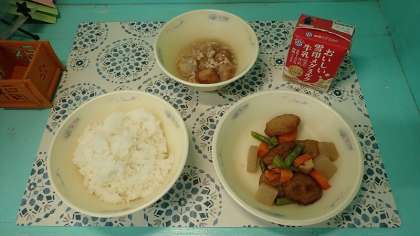 「揚げ里いものあんかけ」の里いもは、昆布でとっただし、みりん、しょうゆで下味をつけて、米粉をまぶして油で揚げています。香ばしく揚げた里いもに、そぼろあんをかけていただきました。とろみがあり、とてもよい香りのかつおだしの「あん」がとてもよく合います。ごはんともよく合う献立で、おいしくいただきました。