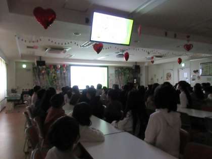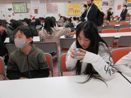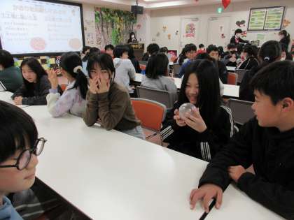 お話を聞いているときのとカカオ豆のにおいを比べているときの様子です。