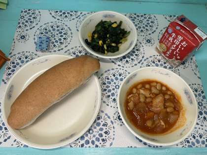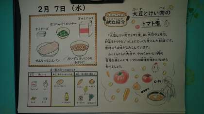 「大豆と鶏肉のトマト煮」は、さっぱりしたトマト味の酸味が魅力の献立です。鶏肉がとてもやわらかく調理されていて、大豆と一緒においしくいただきました。食べ応え満点の献立でした。