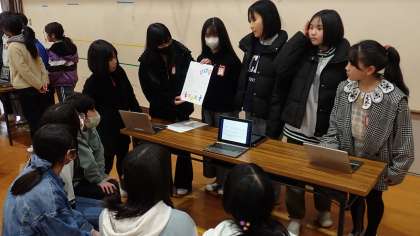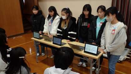 6年生は、体育館で「うめづタイム」の発表を行いました。