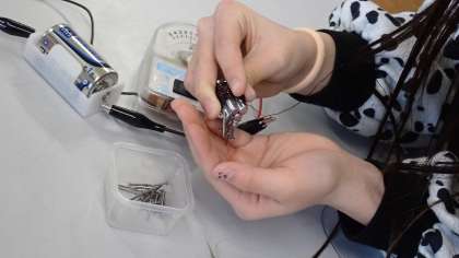 今日は、コイルの中心にある鉄の芯の長さや太さを変えることで、電磁石が強くなるのかを実験しています。鉄芯以外の条件を変えずに実験結果を比較することで、電磁石の強さがどう変わるかを確かめることができます。太い鉄芯で実験すると、たくさんの釘を引き付け、電磁石の力が強くなっていることが分かりました。
