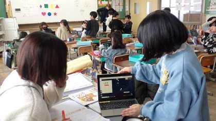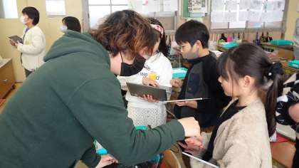 このUnitでは、いろいろな形の英語での言い方を学習しました。子どもたちは、タブレットで三角形や四角形、円などの形を組み合わせていろいろな絵をかきました。今日は、作った形をみんなで尋ね合いました。ALTの先生にも、自分から進んで見せに行っていました。