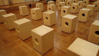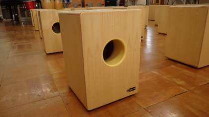 新しく明るい色の椅子が並んでいます。でも、よく見ると、この椅子にはまるい穴が…。実は、この椅子は、「カホン」という楽器です!箱の前面(穴の開いている反対の面)には中に弦が張ってあり、胴を手で打つことで音を出すことができます。打つ場所によっていろいろな音色の音を出すことができ、ドラムセットのようにして楽しむことができます。