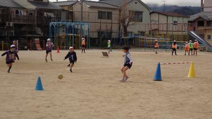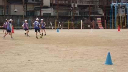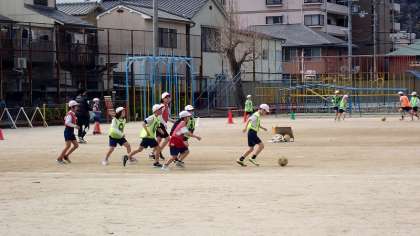 ボールの扱いにも少しずつ慣れ、ゲームを楽しむことができるようになってきました。チームの友達と声を掛け合って、ゴールめざして一生懸命にプレーしています。