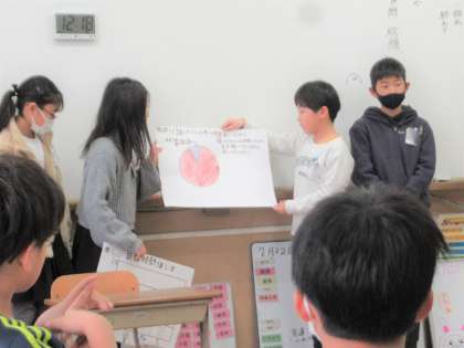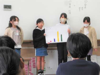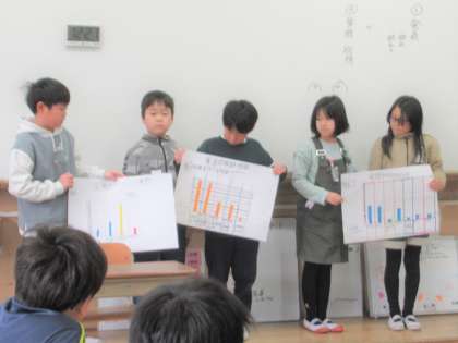 国語科の学習で自分たちの生活について調べるアンケート作りをしました。『睡眠時間について』『食事の栄養バランスについて』……など、テーマは様々です。どのグループもアンケート結果をグラフにまとめながら、伝えたいことを一生懸命考えていきました。
