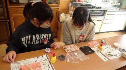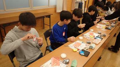 細かい作業をするので、根気のいる時間が続きます。集中して一心不乱に取り組む子、ときどき息抜きをしながらがんばる子と取り組み方は様々ですが、みんな楽しそうにつくりました。作り方に困ったときは、友達と教え合いながら一緒に作っています。難しいところは、先生がていねいに教えてくださいました。