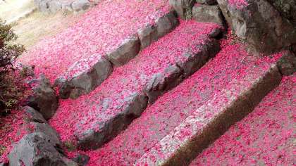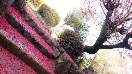 先週、雨で花びらが落ちて、中庭の池の近くの階段がピンク色に染まっていました。2年生の子と「梅の花びらだね」と話していると、「違うよ」いう返事。「あれ?」と思っていると、その子は、「『梅のじゅうたん』だよ」と教えてくれました。