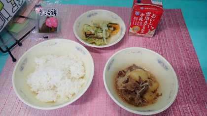 「肉じゃが」は,子どもたちの大好きな献立です。牛肉とじゃがいもに味がよく染みこみ,ごはんによく合う献立でした。「ごま酢煮」は、酢のさっぱりした酸味がちょうどよく、肉じゃがと交互においしくいただきました。