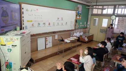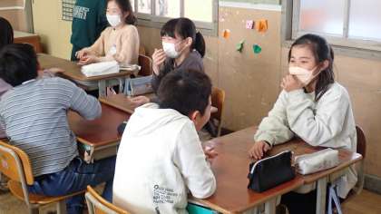 英語での1日の日課を表す表現を知り、慣れ親しむために「キーワードゲーム」をしました。手を頭の上に置き、担任の先生が言う英語の表現をリピートし、「キーワード」に決めた表現を言った瞬間に消しゴムを取り合います。みんな、夢中になってゲームを楽しんでいました。