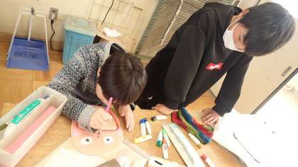 自分の作りたい伝言板を板にかき写し、下描きの線に沿って電動糸のこぎりで切っていきます。慎重に板を回し、少しずつ切り進めることができました。切った部品は紙ヤスリをかけて、色を塗っていきます。