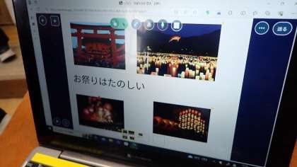 京都を訪れたことのない人に京都の魅力を伝えるためのプレゼンテーションをつくっています。「お土産」「食べ物」「祭」などテーマごとにグループになって、魅力を伝えるためにはどうすればよいかを話し合い、プレゼンにまとめています。